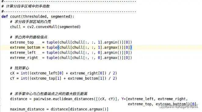 - 找到分割的手部区域的凸包(轮廓),并计算凸包中的最极端点(极端顶部,极端底部,极端左侧,极端右侧)。