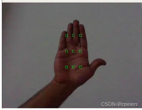 绿色矩形绘制在框架上,用户将手放在这些矩形内。应用程序从用户的手中获取肤色样本,然后创建直方图。