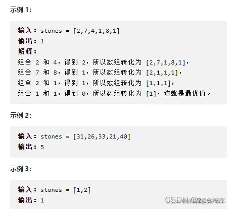 新重量为 y-x。最后,最多只会剩下一块 石头。返回此石头 最小的可能重量 。如果没有石头剩下,就返回 0。