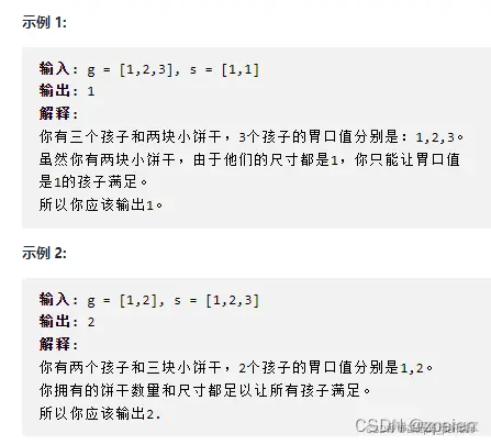 对每个孩子 i,都有一个胃口值 g[i],这是能让孩子们满足胃口的饼干的最小尺寸;并且每块饼干 j,都有一个尺寸 s[j] 。如果 s[j] >= g[i],我们可以将这个饼干 j 分配给孩子 i ,这个孩子