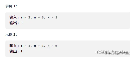 地上有一个m行n列的方格,从坐标 [0,0] 到坐标 [m-1,n-1] 。一个机器人从坐标 [0, 0] 的格子开始移动,它每次可以向左、右、上、下移动一格(不能移动到方格外),也不能进入行坐标和列坐标的数位之和大于k的格子。例如,当k为18时,机器人能够进入方格 [35, 37] ,因为3+5+3+7=18。但它不能进入方格 [35, 38],因为3+5+3+8=19。请问该机器人能够到达多少个格子?