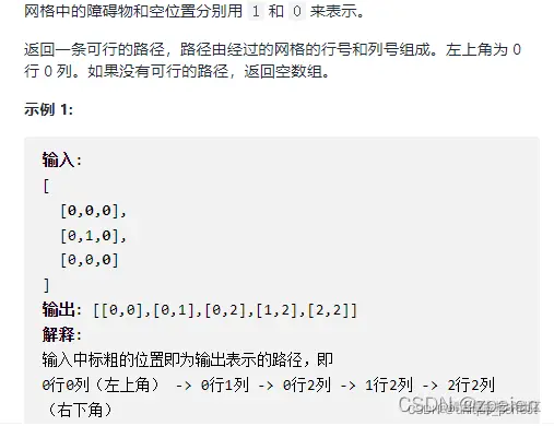 设想有个机器人坐在一个网格的左上角,网格 r 行 c 列。机器人只能向下或向右移动,但不能走到一些被禁止的网格(有障碍物)。设计一种算法,寻找机器人从左上角移动到右下角的路径。
