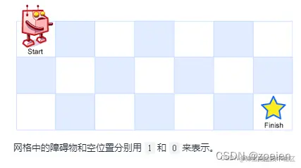 机器人每次只能向下或者向右移动一步。机器人试图达到网格的右下角(在下图中标记为 “Finish” )。