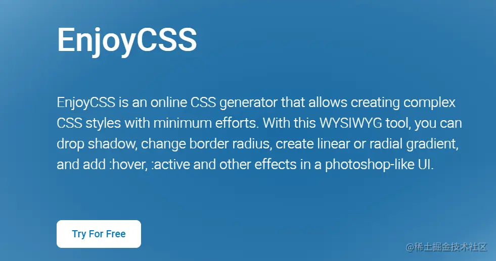 EnjoyCSS他是一个CSS代码生成工具,提供一个简单的交互界面,帮助你设计元素,无需编码就可以调节出丰富的图形样式。
