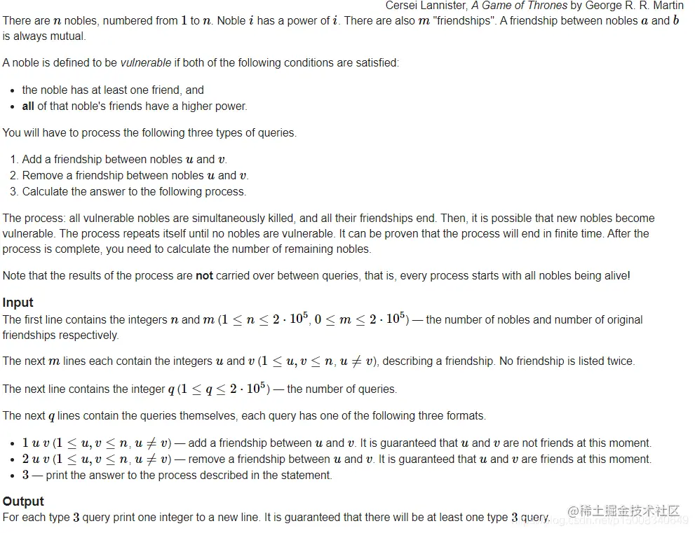 n个人,m个朋友关系,在一个关系中,编号较小的那个人权力较小。q次操作:让两个人成为朋友;让两个人断绝关系;杀死所有有朋友的并且他的所有朋友的权力都比他大的人,重复该操作直到没有可以杀掉的人,该操作不影响后续关系。