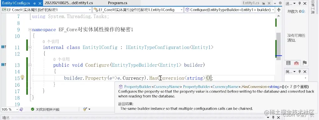 2、在EF Core中,实体的属性可以定义为枚举类型,枚举类型的属性在数据库中默认是以整数类型来保存的。对于直接操作数据库的人员来讲,0、1、2这样的值没有“CNY”(人民币)、“USD”(美元)、“NZD”(新西兰元)等这样的字符串类型值可读性更强。EF Core中可以在Fluent API中用HasConversion()把枚举类型的值配置成保存为字符串。(看图二)