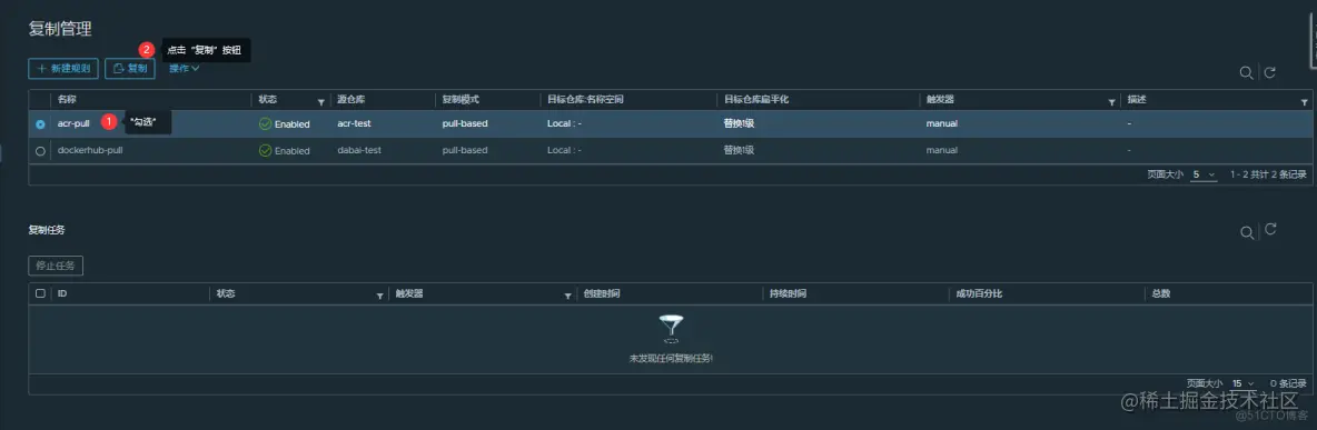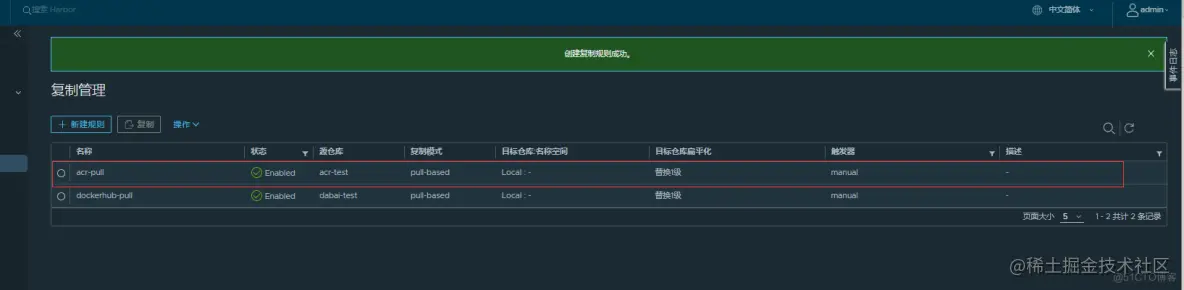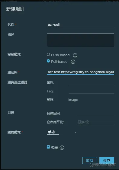 - 复制模式:pull-bashd就是将阿里云上的镜像拉到Harbor,Push则相反;