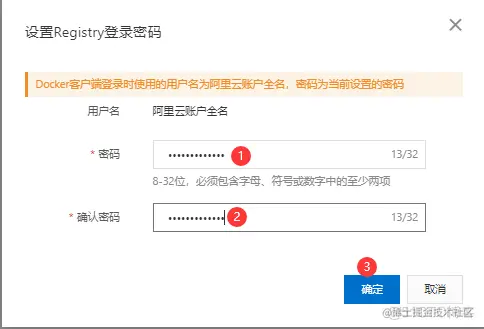 Docker客户端登录时使用的用户名为阿里云账户全名,密码为当前设置的密码