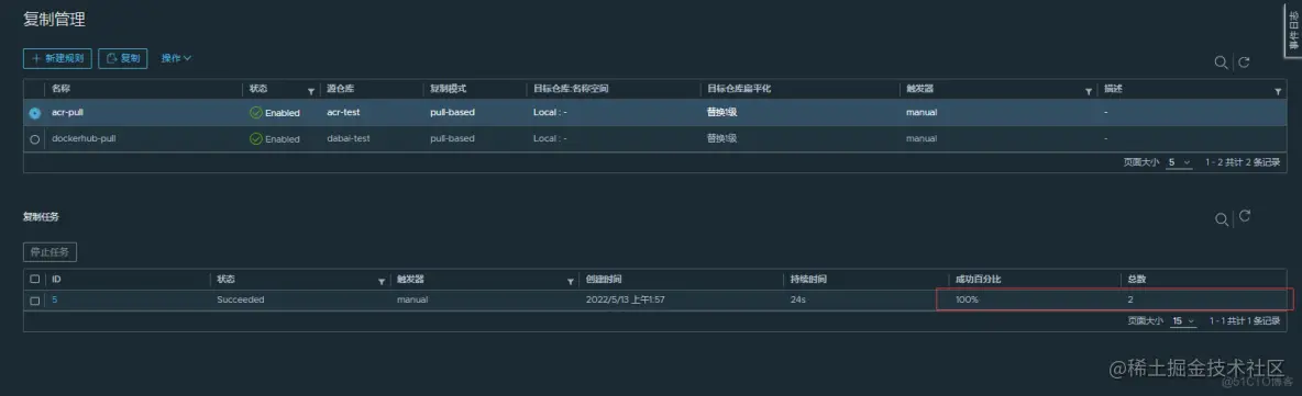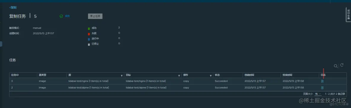 在执行复制任务完成后,查看【复制任务】对应ID的事件【成功百分比】是否为100%,如果是100%则表示全部迁移成功,然后检查两端的镜像数量是否一致。