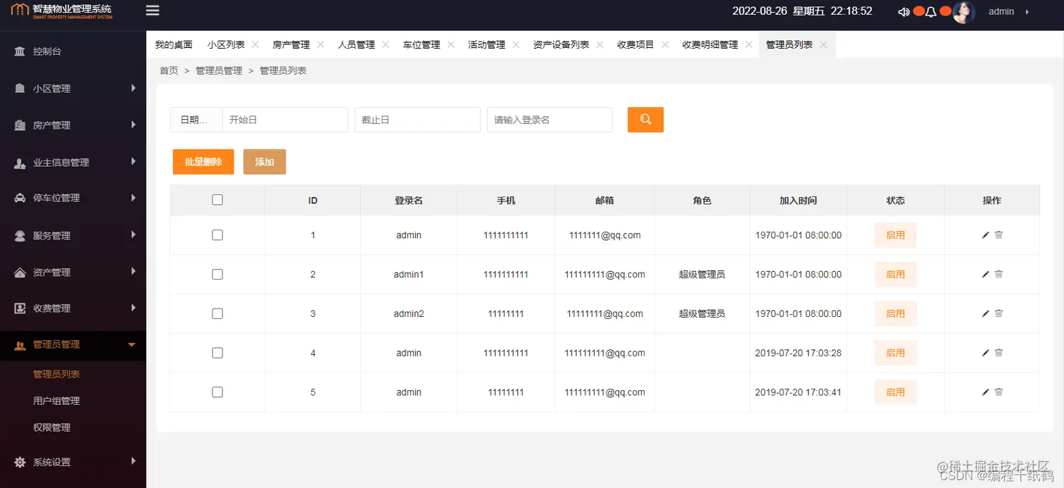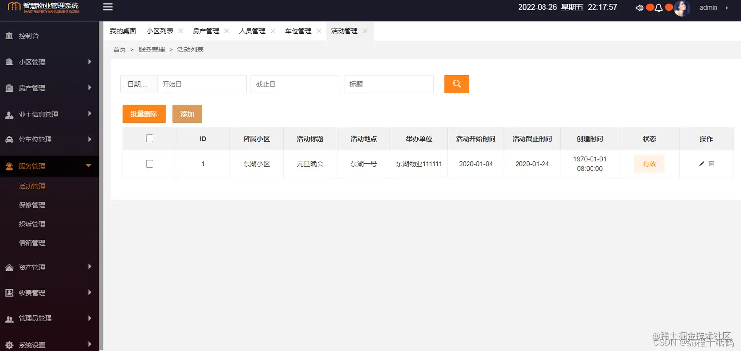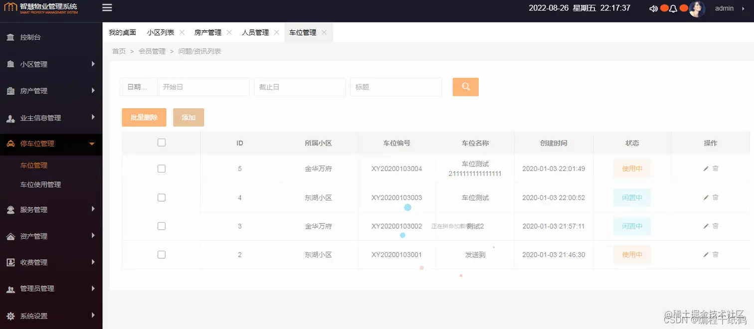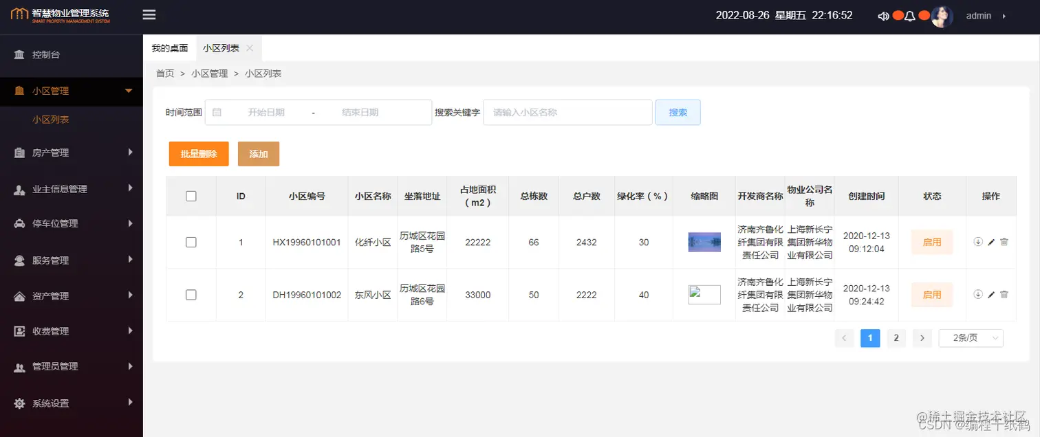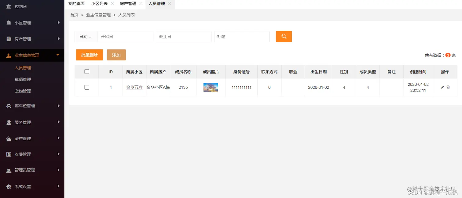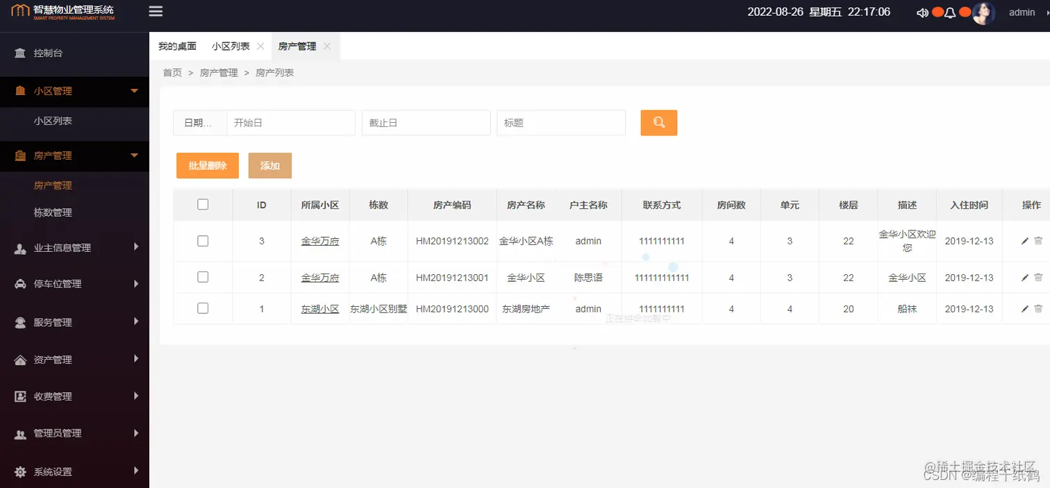 4. 小区管理模块实现了从前端到控制层、业务层、持久层的完整功能,可以参照该模块实现其他功能。