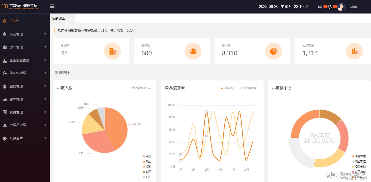 使用SpringBoot+Mybatis+BootStrap+Layui+VUE制作的智慧小区物业管理系统。 本系统采用了 B/S 架构,Java、Html、Css、Js 等技术,使用了主流的后台开发框架SpringBoot(SpringMVC+Spring+Mybatis),前端开发框架使用了 LayUI、Vue、JQuery 以及 Vue的前端组件库 Element-UI,采用了开源的轻量级数据库 Mysql 进行开发。实现了小区管理、房产管理、设备管理、业主管理、服务管理、车位管理等主要功能。提升物业管理水平,提高工作效率,降低成本,便于物业快速回收物业费;扩大服务范围和能力,方便住户,提升用户满意度;为物业公司扩展了新的收入渠道:租赁中介、社区团购、物业服务;为住户缴纳物业费、水电、停车费等生活费用,提供在线支付,方便快捷。