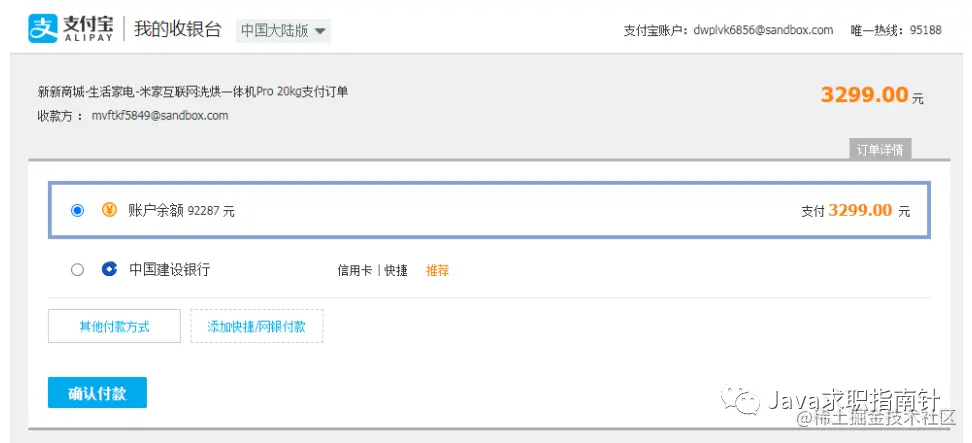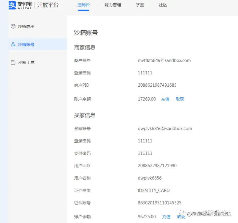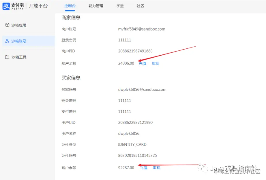 可以对照着沙箱的商家账户和买家账户的钱数来看看是否实现了买家账户扣款和商家账户收款的功能。