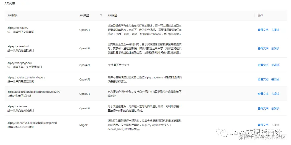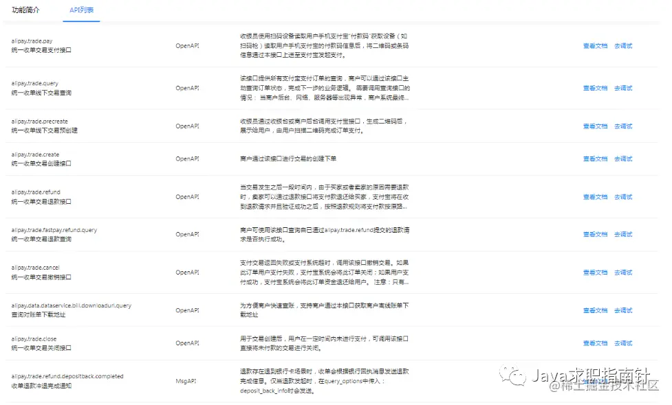 各个接口有在线文档和在线调试的案例,可以自行查看。以其中的统一收单线下交易预创建为例说明: