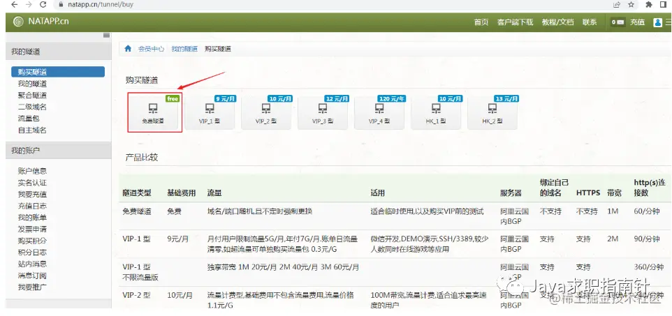 2、登陆后选择购买隧道:选择免费隧道(有效期一个月)