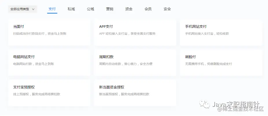 支付宝支付提供了很多种支付应用场景以及对应的API应用,打开网址:open.alipay.com/api