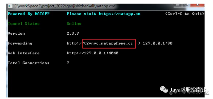 7、启动客户端:windows下,直接双击natapp.exe 即可。红框内就是我们的隧道通信地址。