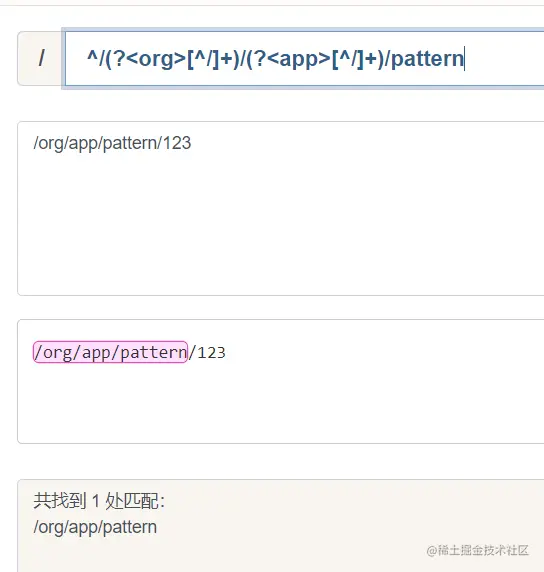 String regular = "^/(?<org>[^/]+)/(?<app>[^/]+)/pattern$";