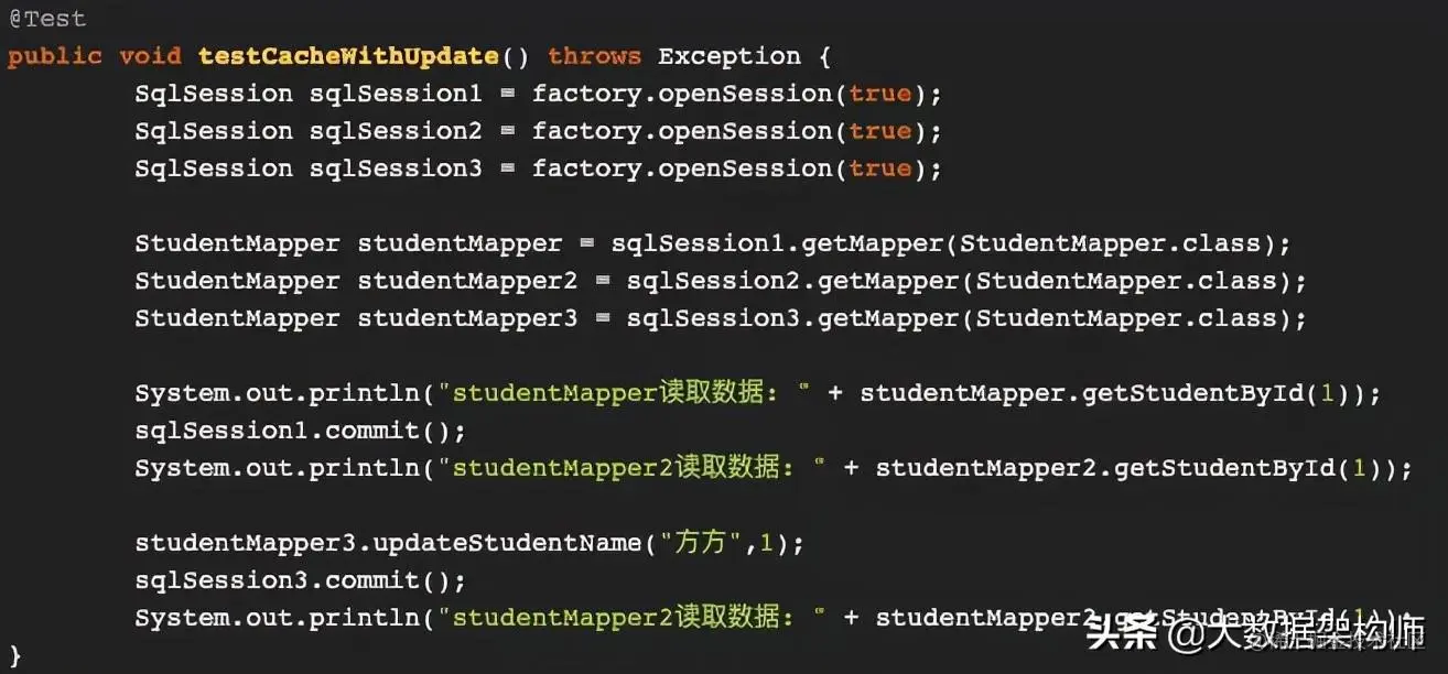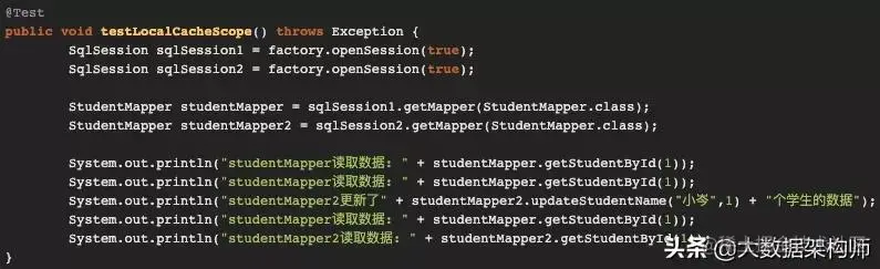 开启两个SqlSession,在sqlSession1中查询数据,使一级缓存生效,在sqlSession2中更新数据库,验证一级缓存只在数据库会话内部共享。
