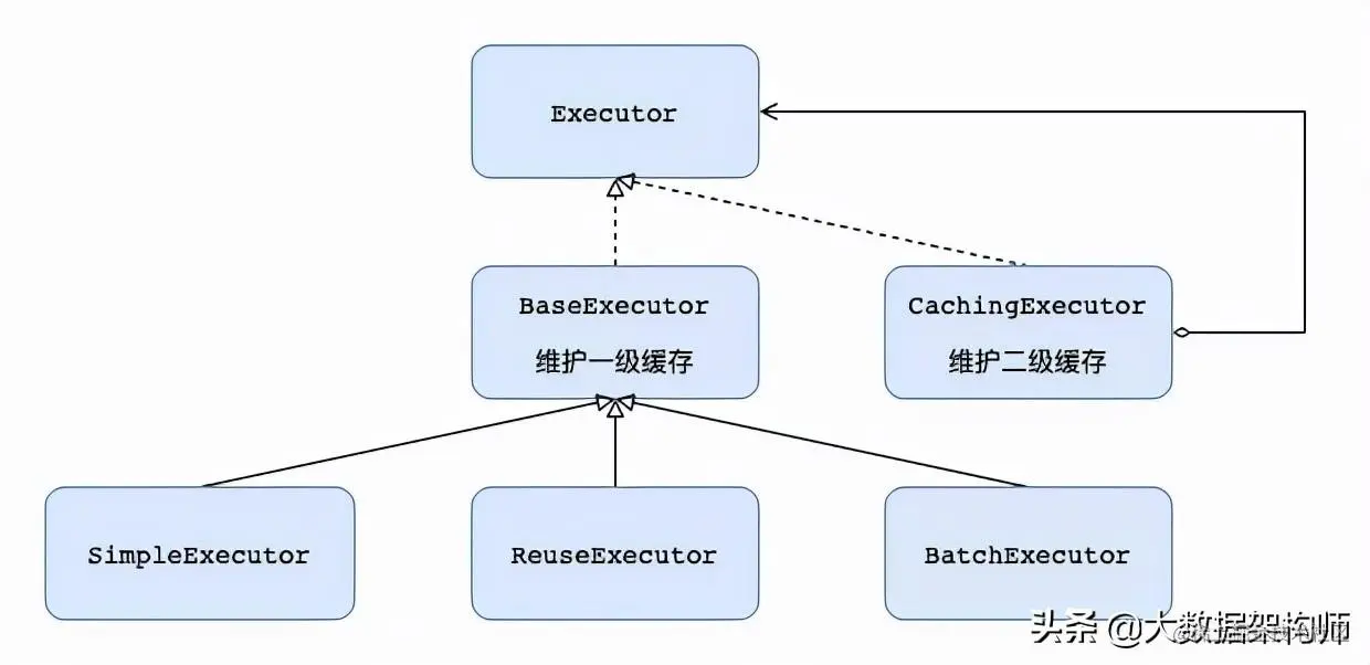 Executor的设计是一个典型的装饰者模式,SimpleExecutor,ReuseExecutor是具体实现类,而CachingExecutor是装饰器类。