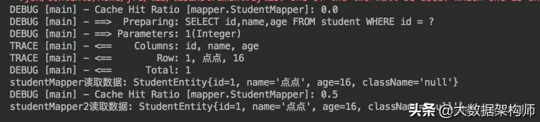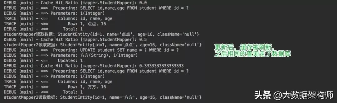 为了解决实验4的问题呢,可以使用Cache ref,让ClassMapper引用StudenMapper命名空间,这样两个映射文件对应的SQL操作都使用的是同一块缓存了。