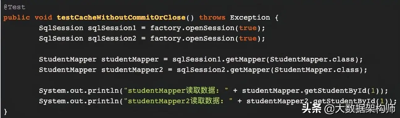 测试二级缓存效果,不提交事务,sqlSession1查询完数据后,sqlSession2相同的查询是否会从缓存中获取数据。
