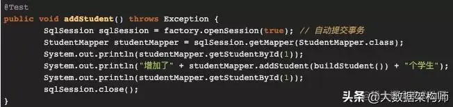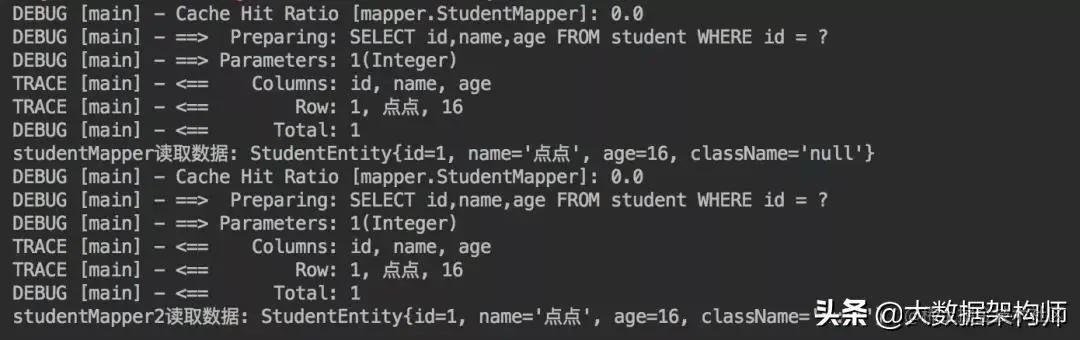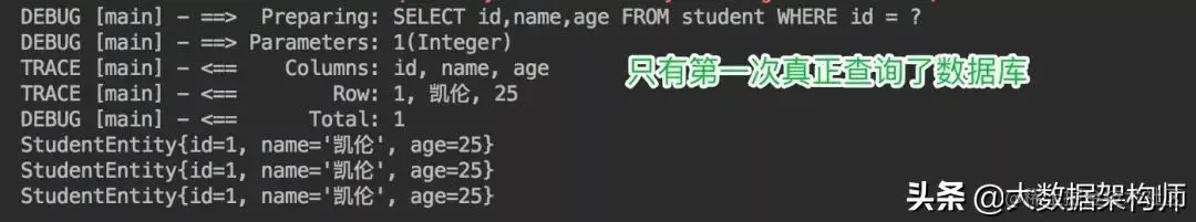 开启一级缓存,范围为会话级别,调用三次getStudentById,代码如下所示: