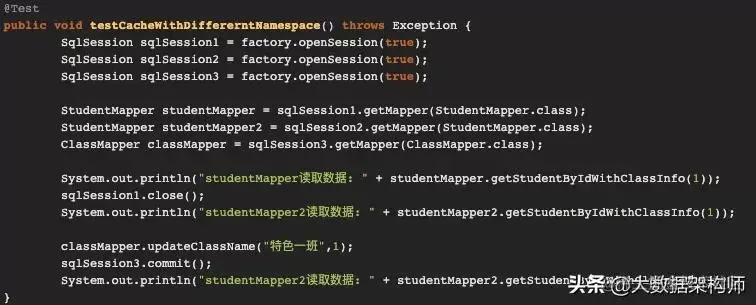 当sqlsession1的studentmapper查询数据后,二级缓存生效。保存在StudentMapper的namespace下的cache中。当sqlSession3的classMapper的updateClassName方法对class表进行更新时,updateClassName不属于StudentMapper的namespace,所以StudentMapper下的cache没有感应到变化,没有刷新缓存。当StudentMapper中同样的查询再次发起时,从缓存中读取了脏数据。