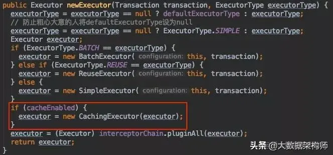 从Configuration类的newExecutor方法可以看到,当cacheEnabled为true,就用缓存装饰器装饰一下具体组件实现类,从而让二级缓存生效