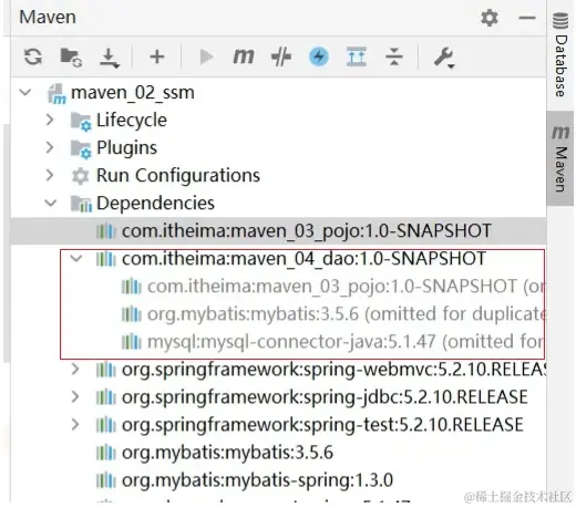 当然 exclusions 标签带 s 说明我们是可以依次排除多个依赖到的jar包,比如maven_04_dao中有依赖junit和mybatis,我们也可以一并将其排除。