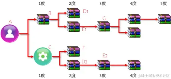 相对于A来说,A直接依赖B和C,间接依赖了D1,E1,G,F,D2和E2
