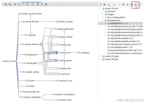 如果想更全面的查看Maven中各个坐标的依赖关系,可以点击Maven面板中的 show Dependencies ,例如