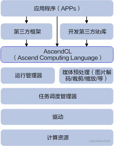 2. 供第三方框架调用:用户可以通过第三方框架调用AscendCL接口,以便使用昇腾AI处理器的计算能力。