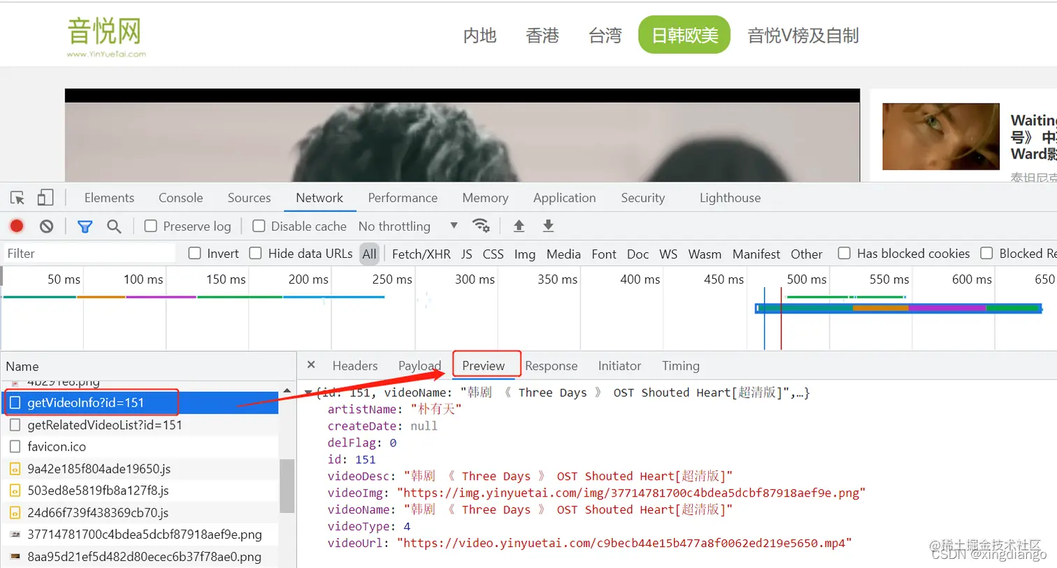 我们的思路是找到视频的播放链接地址,然后打开再写入本地文件,所以需要在里面找到有用的东西,通过认真寻找找到有个链接的返回有如下信息,可以点开Response,但是json格式,这里我们点开Preview预览可以看到如下相关的MV信息,里面有个videoUrl,这里就是我们要的播放链接: