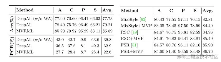 表5:左表为ResNet-18在PACS数据集上不同方法的准确率和预测变化率(PCR)。右表显示了在PACS数据集上将MVP应用于其他SOTA方法的准确率(%)。