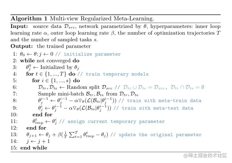 此外,在不同的轨迹中对不同的任务进行采样,以鼓励临时模型的多样性。从这些任务中学习可以利用补充视图探索权重空间中的不同信息。完整算法如算法1所示,如图2所示。