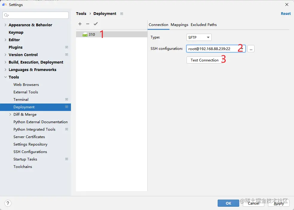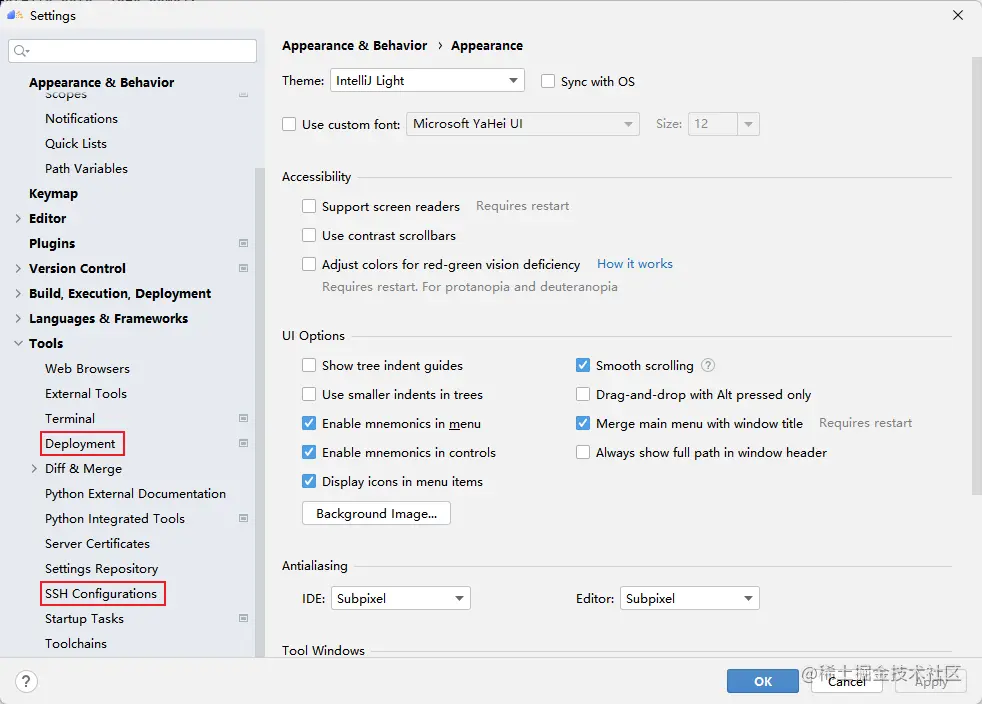 在MindStudio的远程服务中,定义了SSH 配置和Deployment两个概念。前者SSH 配置类似MobaxTerm中的Session的概念,用户可以保存多个远程服务器的连接配置。后者Deployment管理远程开发时的本地文件与远程文件的同步。配置好Deployment后,我们就可以像使用本地python环境一样去使用远程的python环境了。点击File -> Settings -> Tools,即可看到两个设置的入口,下面分别介绍如何配置他们。