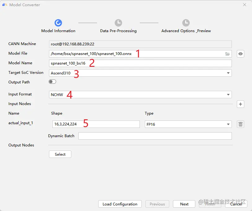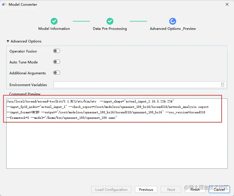 MindStudio自动生成如下atc指令,用户可以在此做最后的校验,点击Finish即可开始进行模型转换。