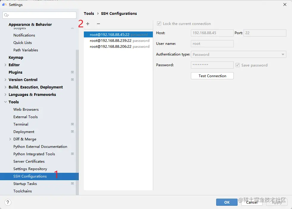 首先点击SSH Configurations,再点击 + 配置远程连接,然后根据选项填入自己服务器的ip地址、端口号、用户名和密码等。测试成功点击Apply即可保存配置,以后就可以一键连接啦!