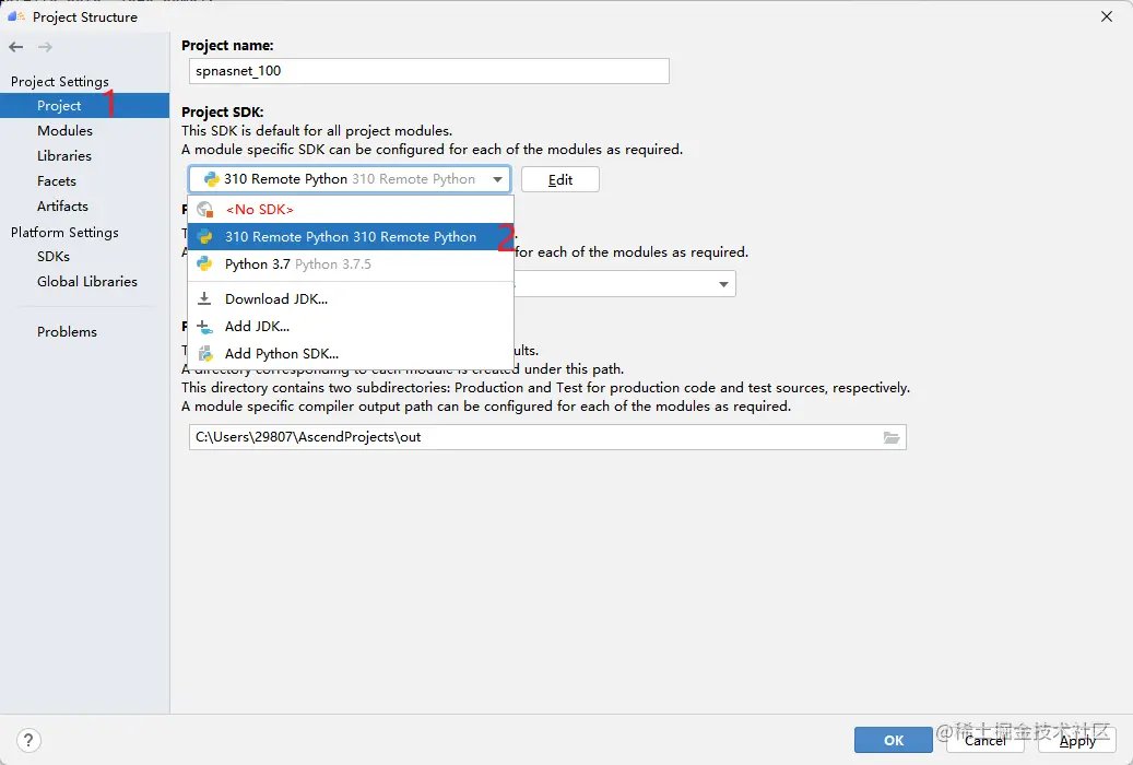 然后点击Project,选择刚才添加到MindStudio中的python解释器,将其作为本项目使用的解释器。
