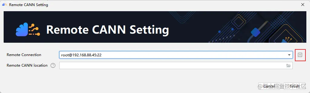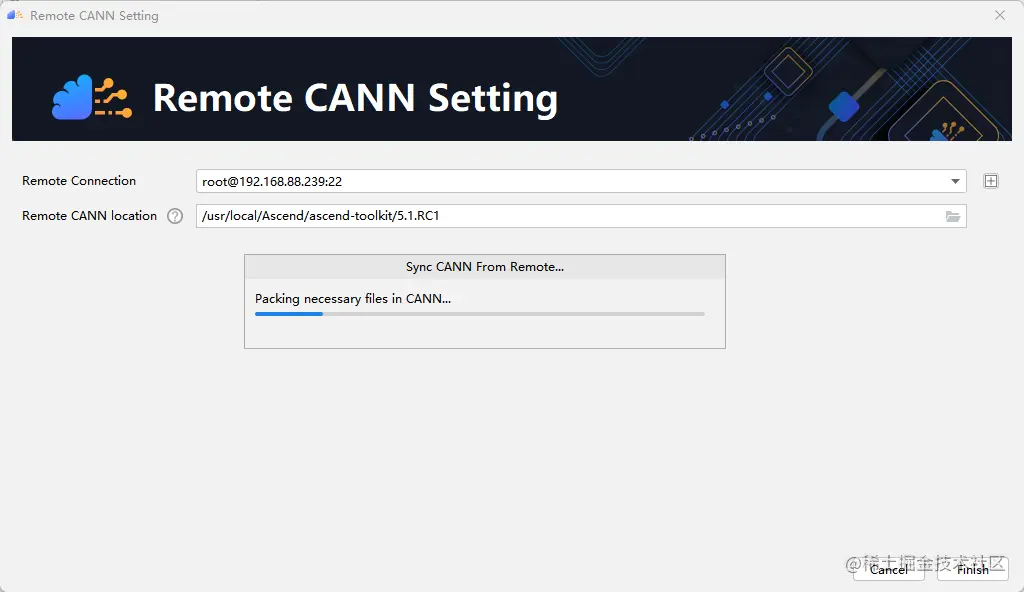 配置Remote CANN location。该参数需要填入ascend-toolkit在服务器上的路径地址。在这里,我们toolkit的路径如下:/usr/local/Ascend/ascend-toolkit/5.1.RC1。点击finishing进行配置。初次配置时时间稍长,请耐心等待。