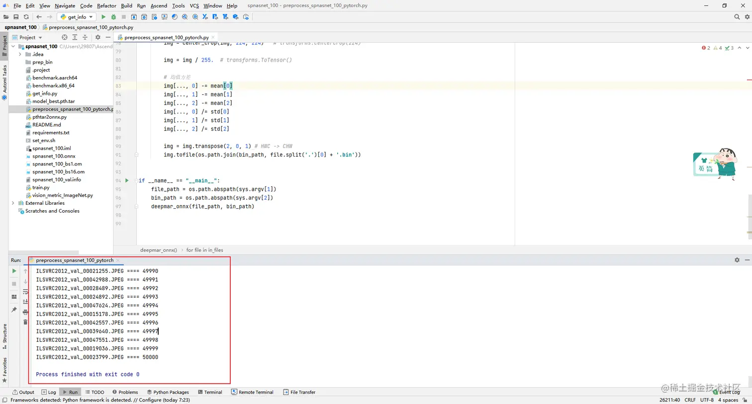 上传好数据集以后,执行 preprocess_spnasnet_100_pytorch.py脚本,生成数据集预处理后的bin文件。