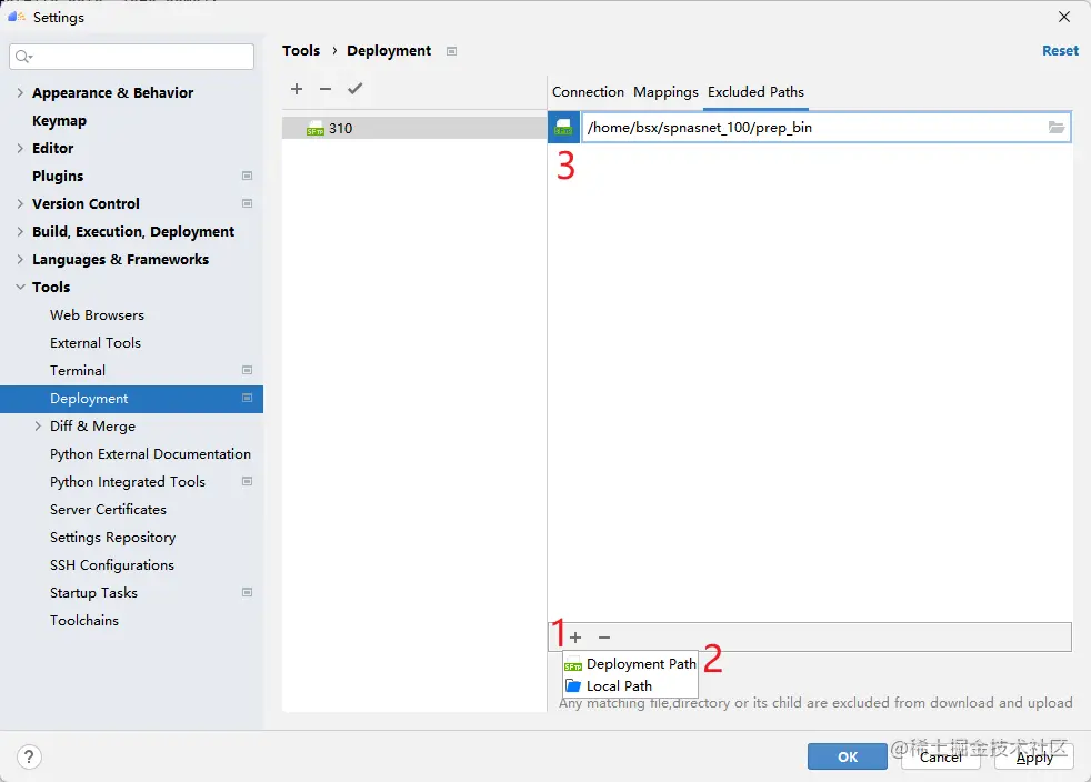 配置好Mappings后,建议配置Excluded Paths,因为MindStudio的默认同步行为会把Mappings对应目录的文件保持完全相同,这意味着只存在于远程的数据集文件夹会被删除(如果本地没有数据集)。在此我配置了几个需要排除的文件夹目录。
