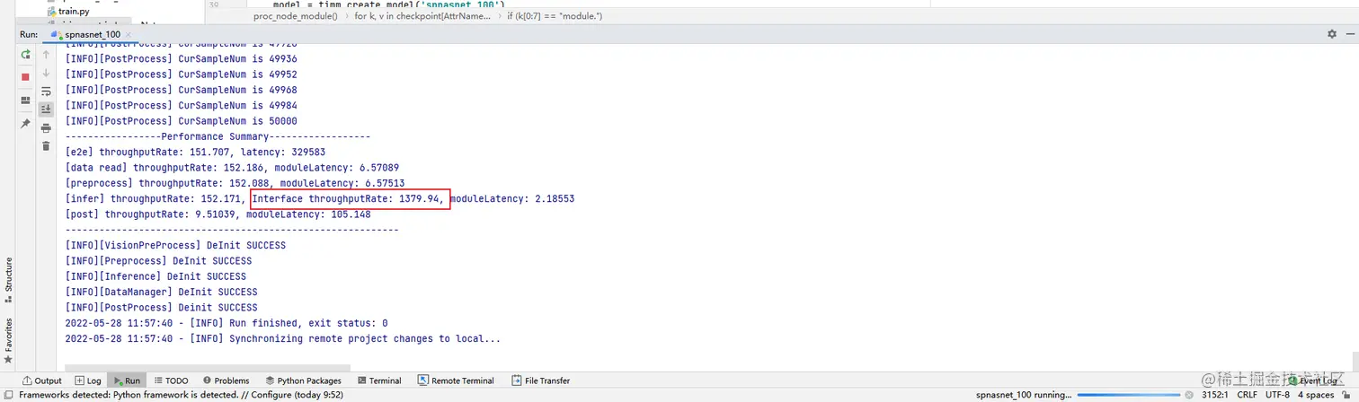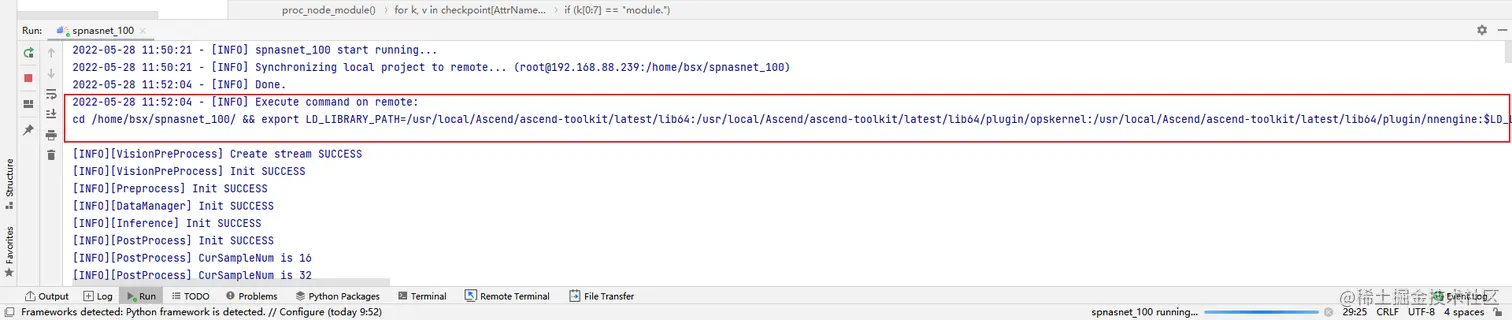 MindStudio会首先上传本地文件到远程服务器,将本地的文件同步到远程这个过程可能很慢,同步完成后开始运行Python代码,MindStudio会实时地在控制台打印输出:
