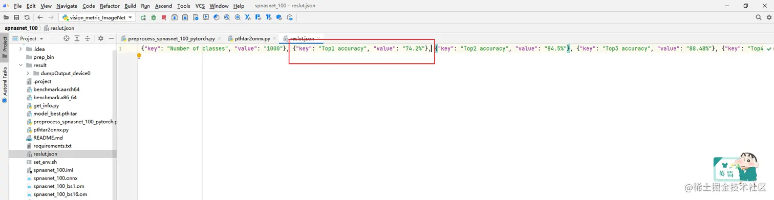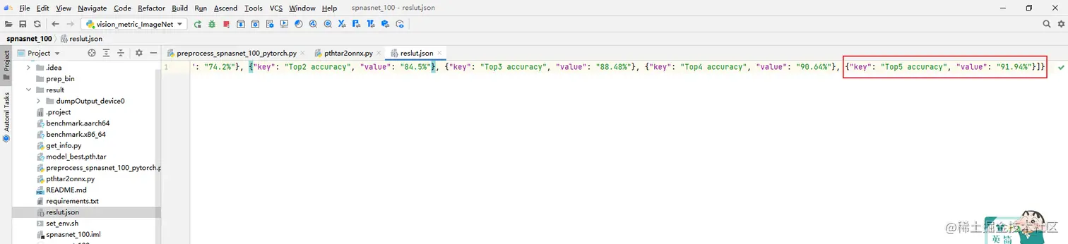 调用vision_metric_ImageNet.py脚本与数据集标签val_label.txt比对,可以获得Accuracy Top5数据,结果保存在result.json中。