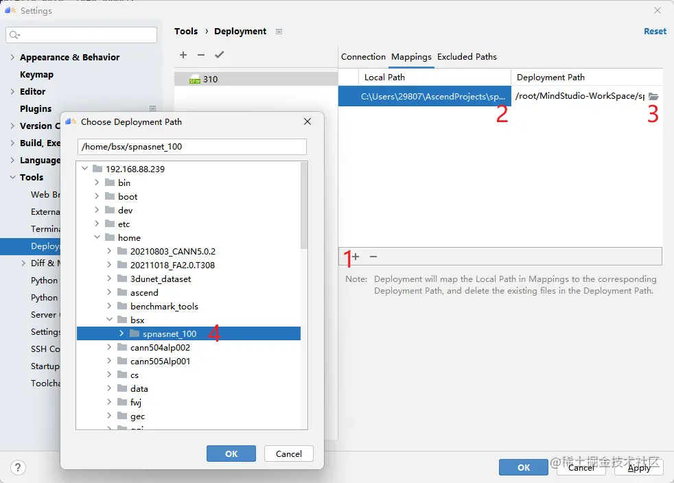 下一步,设置项目目录映射关系,点击Mappings,然后选择本地的项目目录和远程的项目目录(最好是提前创建好文件夹),接下来跑代码的时候MindStudio会保证这两个目录文件的同步。