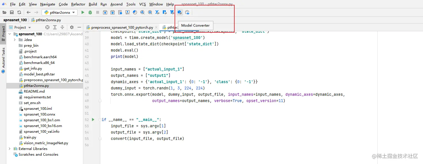 从onnx转为om需要用atc工具,MindStudio提供了atc工具的窗口化应用,它会根据用户选择自动生成atc指令。Model Converter的入口如图所示: