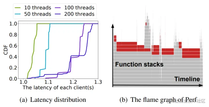其中的原因是:cgroup 实现非常复杂,涉及 10 多类资源控制(cgroup subsys),内核为了简化 cgroup 的设计引入了 cgroup_mutex ,css_set_lock、freezer_mutex、freezer_lock 等大锁,使得 cgroup 相关的操作都是串行化的;在高并发场景下,导致了整个创建链路上的串行执行会拖慢并发创建的效率,增加长尾延迟。图6(b)显示了同时使用 10 个线程创建 2000 个 cgroup 的火焰图。在图中,红色部分显示“互斥锁”被激活。当 mutex 中默认使用了 osq_lock 乐观锁优化,在 cgroup 抢不到锁的情况下会自旋一会儿,导致多线程场景大量消耗 CPU 资源,不能及时退出临界区,从而影响正在运行的函数实例。