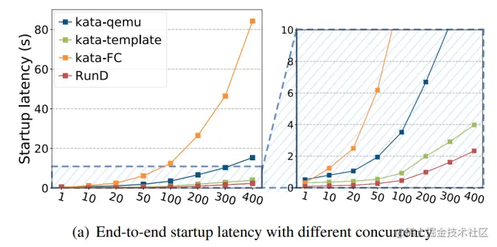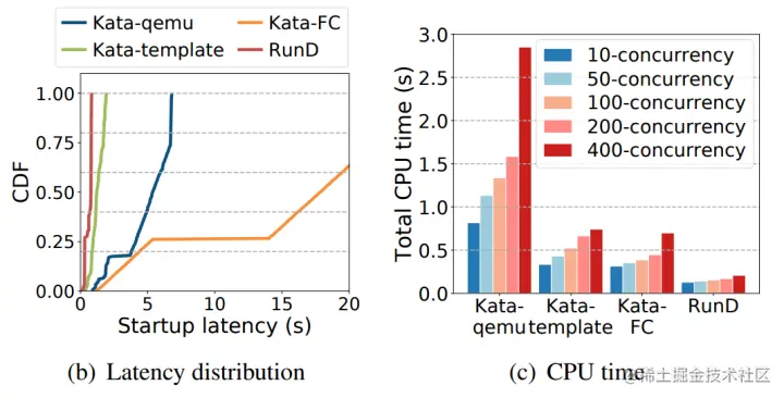 并发性能总结:RunD 能够在 88ms 内启动一个单独沙盒,并具备在 1 秒内同时启动 200 个沙箱的并发能力,与现有技术相比,具有最小的延迟波动和 CPU 开销。