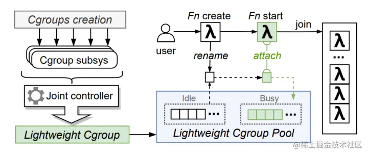 同时我们维护一个 cgroup 资源池,将所有初始创建的 cgroup 标记为空闲;通过一个 mutex 保护空闲链表,创建一个函数实例时,从空闲链表中获取 cgroup,并标记为使用;当容器启动时将线程 attach 到对应分配的 cgroup 即可。当销毁一个函数计算实例时,只需要 kill 对应的实例进程,不需要删除 cgroup;将 cgroup 还会资源池,标记为空闲。需要注意的是 cgroup 资源池管理涉及同步和互斥问题,必须要保证这个临界区很小,否则不能达到提高并行度的效果。