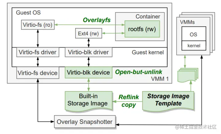 - 使用 overlay snapshotter,创建容器镜像 rootfs,并通过 virtiofs 透传给 VM,作为容器 rootfs 的只读层。